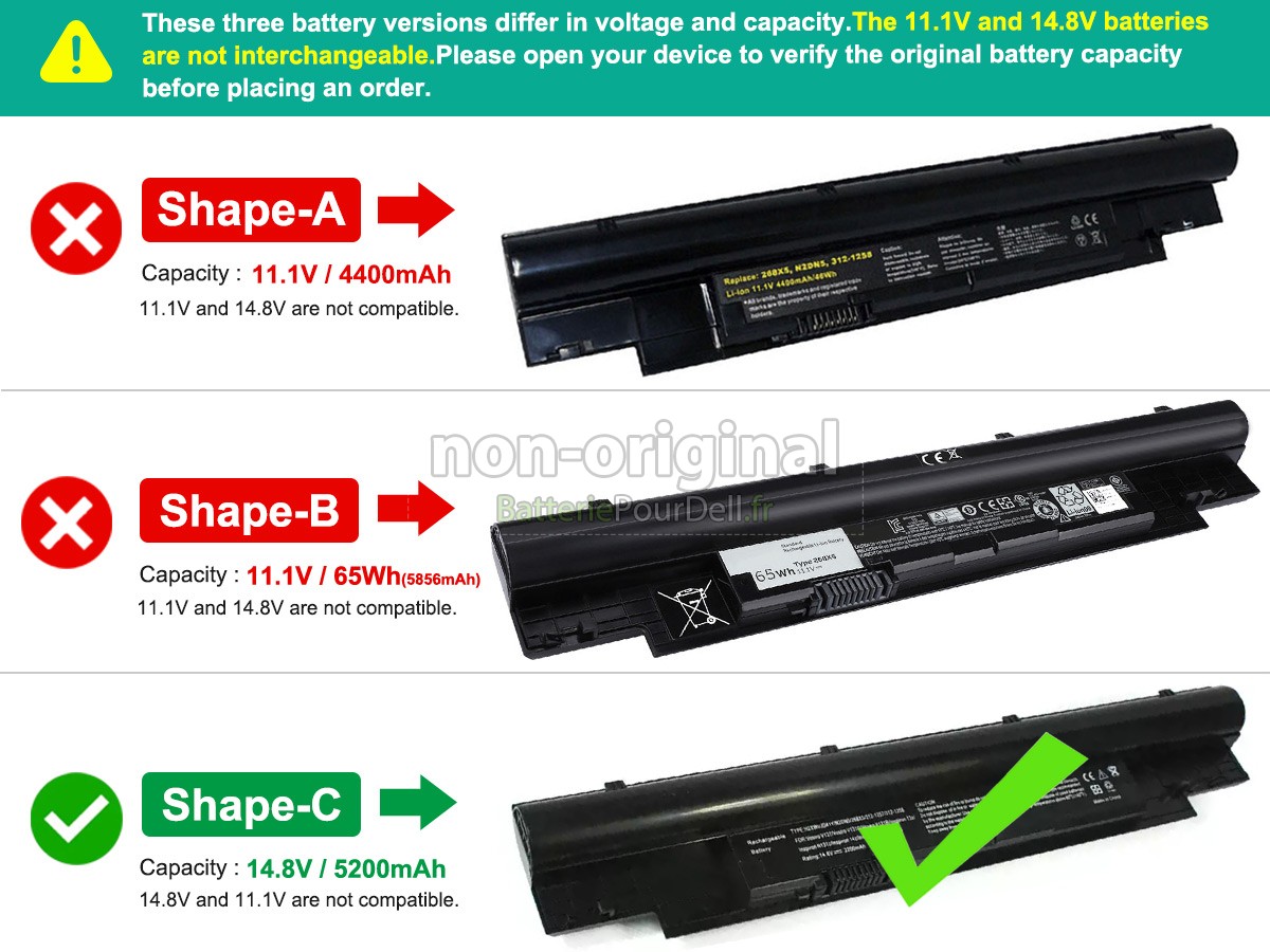 Selon la règle générale, si vous voulez remplacer la batterie d'ordinateur portable, veuillez sélectionner obligatoirement une batterie avec la même tension que la batterie d'origine. Cependant, il existe certaines exceptions. Par exemple, les batteries du même paire ci-dessous ont des tensions compatibles:- 3.6V / 3.7V